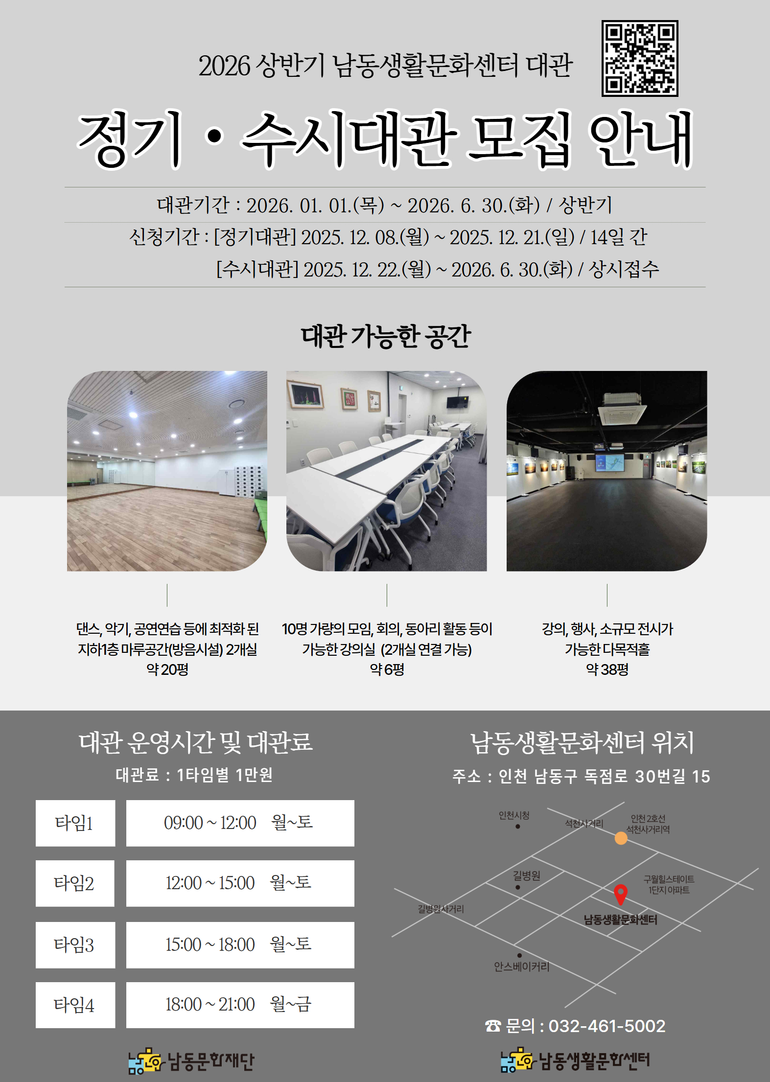 [ 남동생활문화센터 상반기 정기대관 / 수시대관 신청 바로가기 ▶ https://www.namdongcf.or.kr/user/rental/list.php#facility_003001002