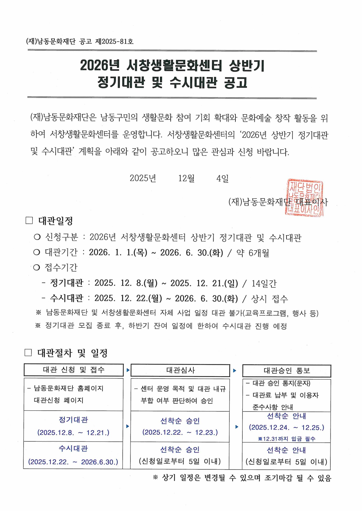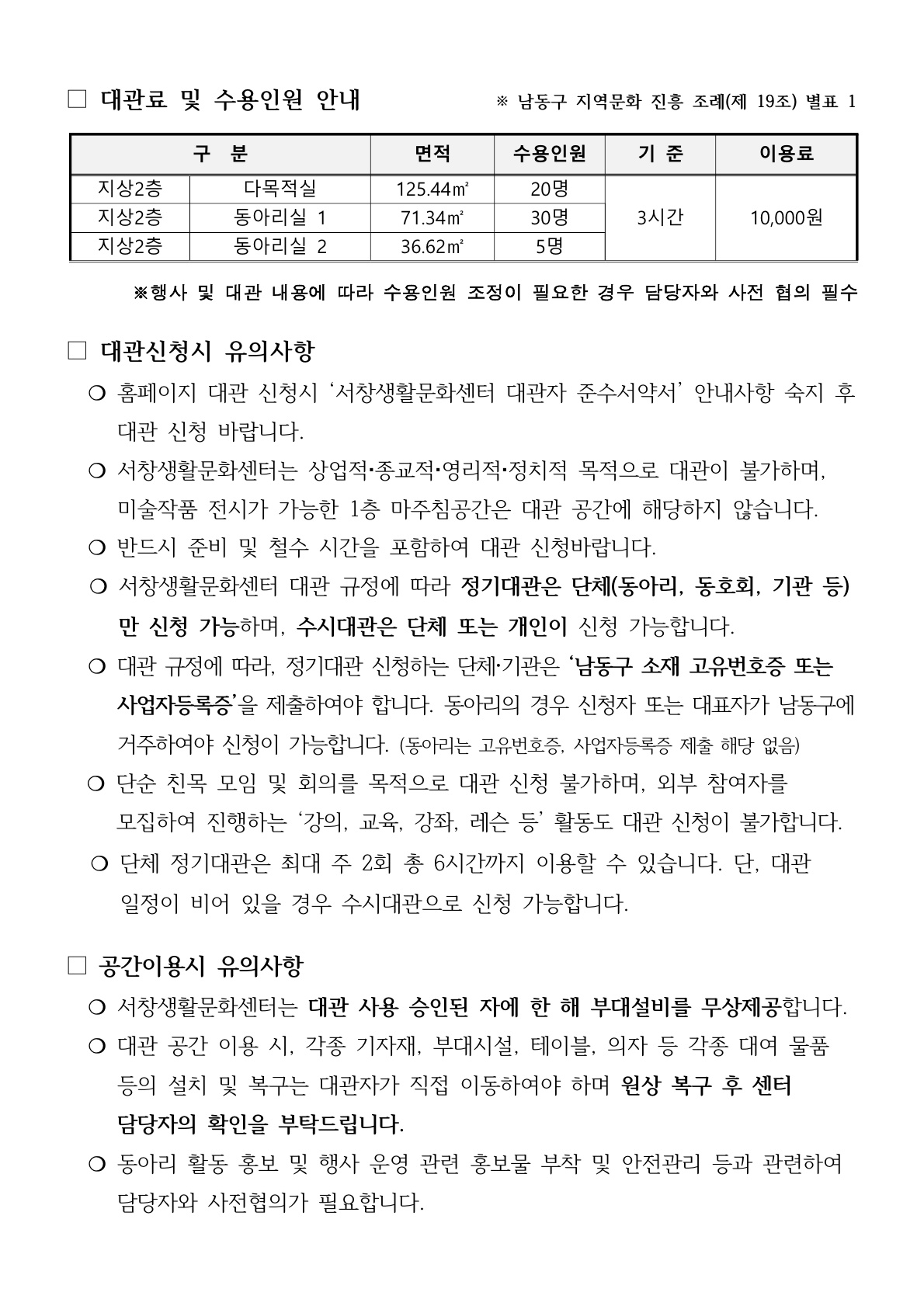[ 2026년 서창생활문화센터 상반기 정기대관 / 수시대관 신청 바로가기 ▶ https://www.namdongcf.or.kr/user/rental/list.php#facility_003001004