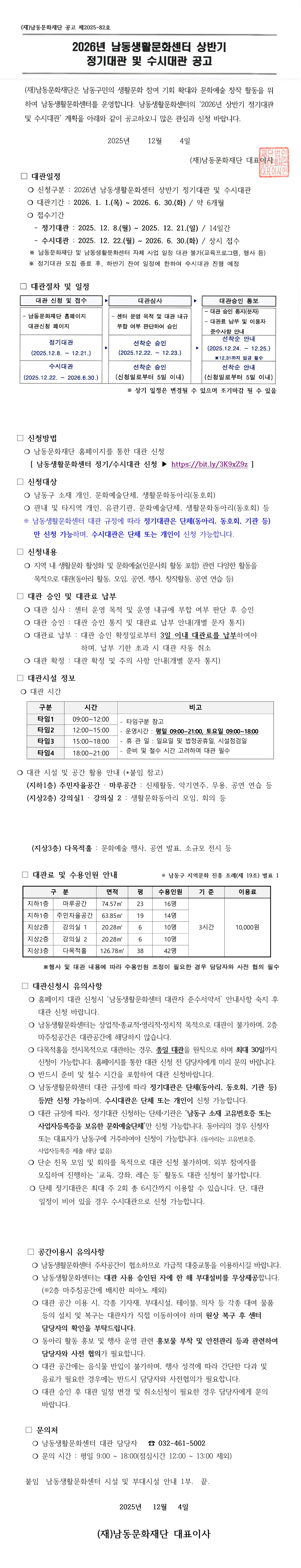 [ 남동생활문화센터 상반기 정기대관 / 수시대관 신청 바로가기 ▶ https://www.namdongcf.or.kr/user/rental/list.php#facility_003001002 ]