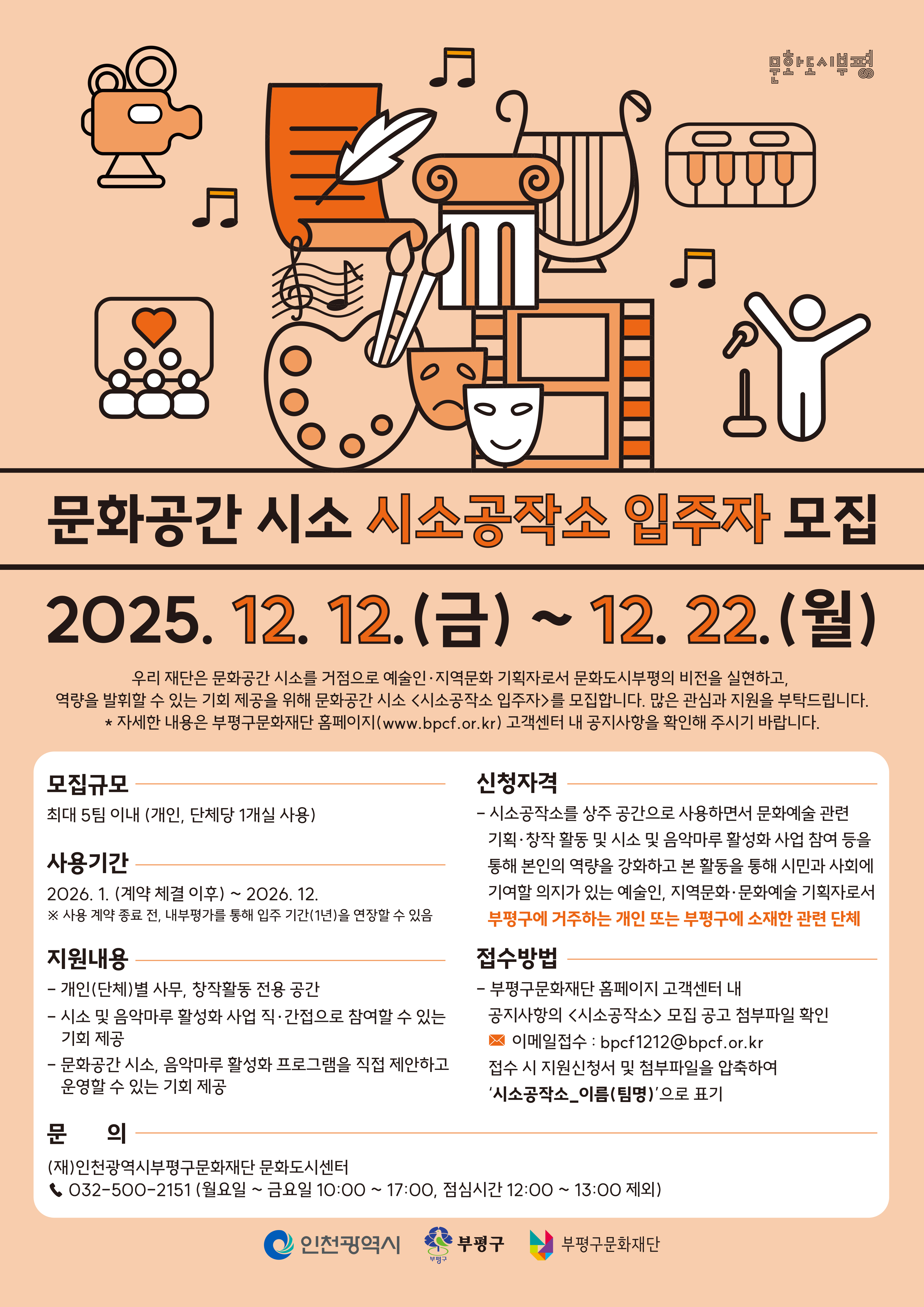 신 청: 부평구문화재단 홈페이지(www.bpcf.or.kr) 고객센터 내 공지사항의첨부파일 작성 후 기재된 메일주소로 접수